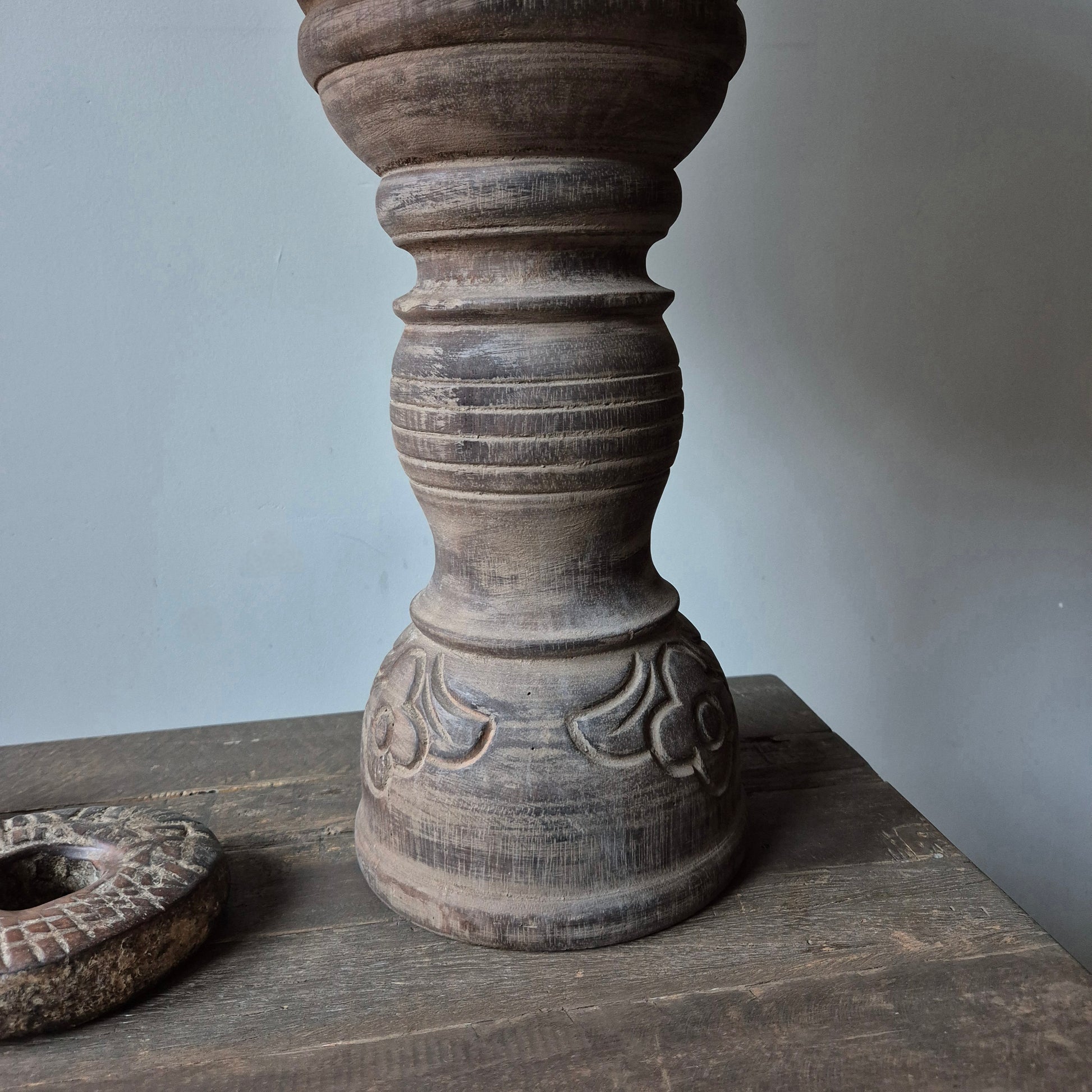 Een prachtig houten baluster tafellamp inclusief shabby lampenkap. Deze lamp staat perfect binnen een stoer, sober en landelijk interieur!