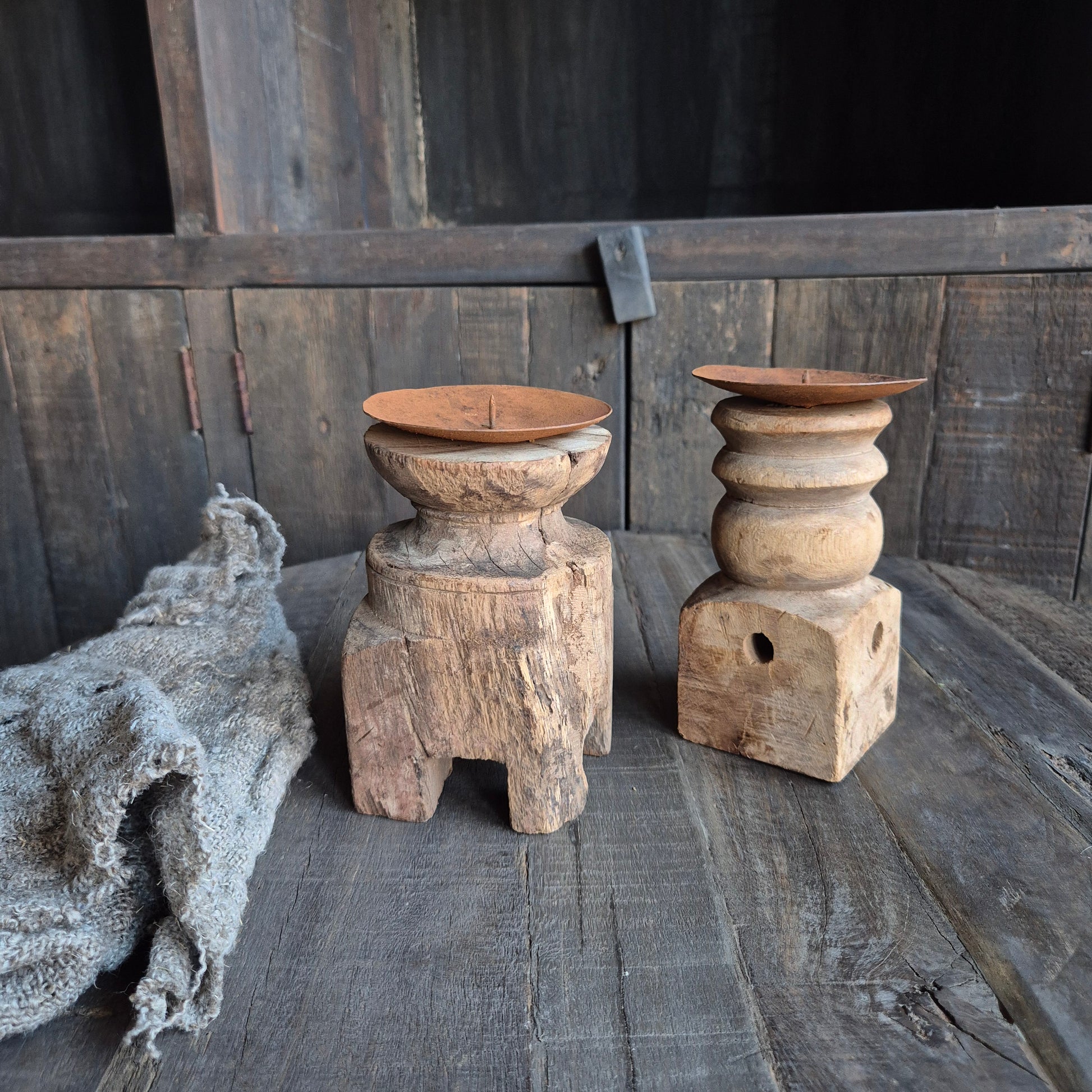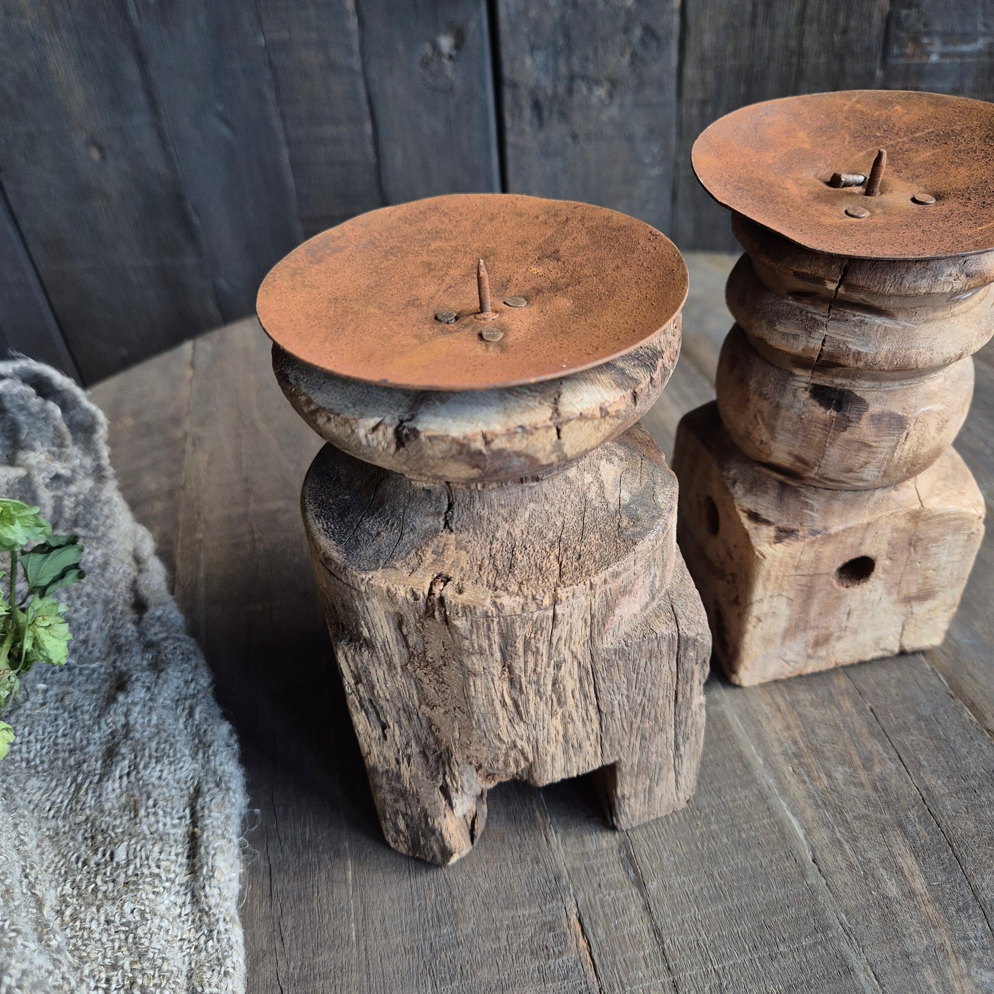 Een mooi oud houten kandelaar met unieke details. Past mooi binnen een stoer, sober en landelijk interieur!