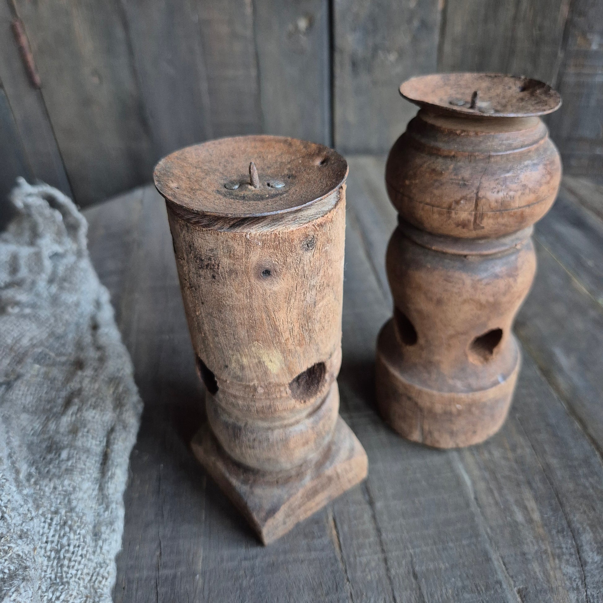 Een mooi oud houten kandelaar met unieke details. Past mooi binnen een stoer, sober en landelijk interieur!