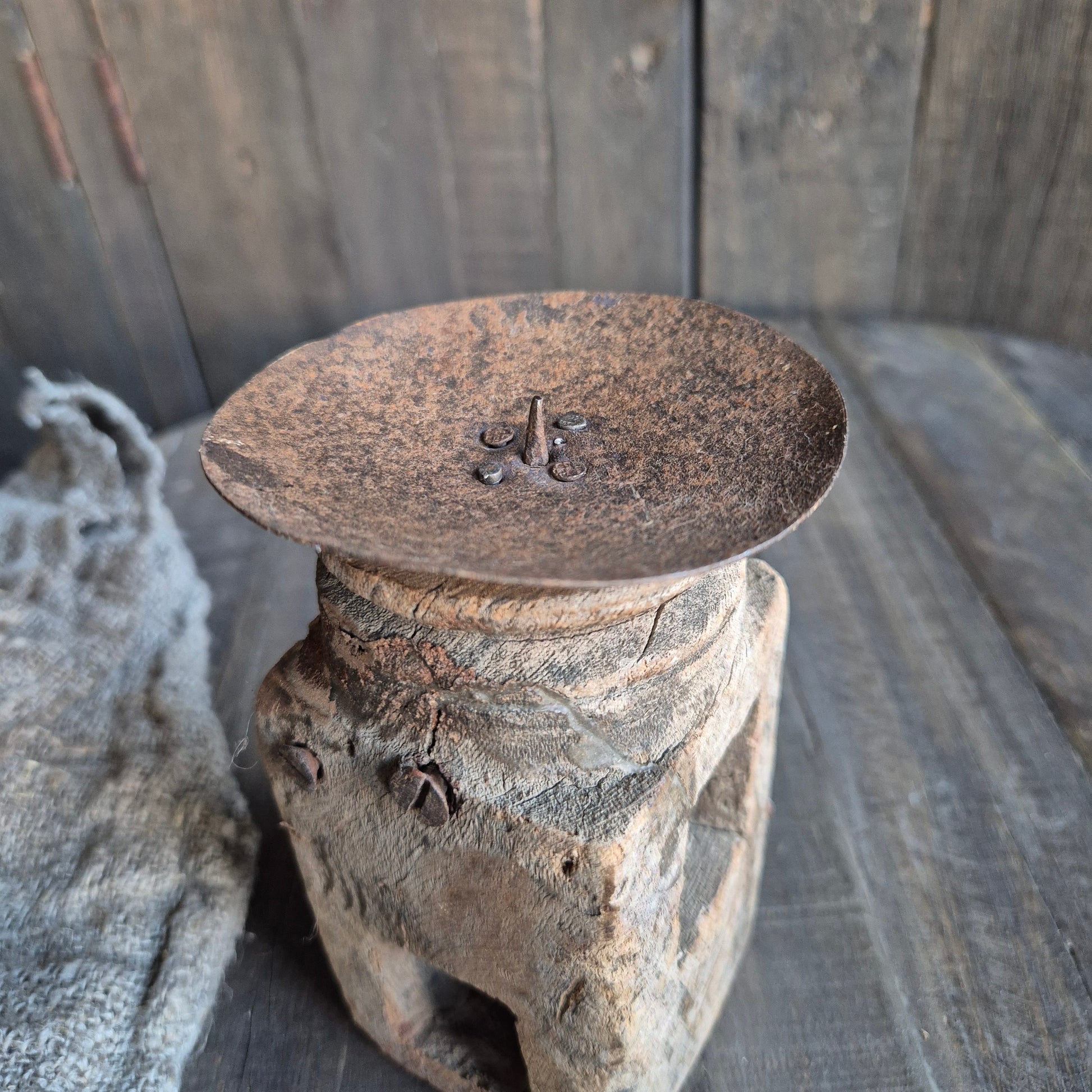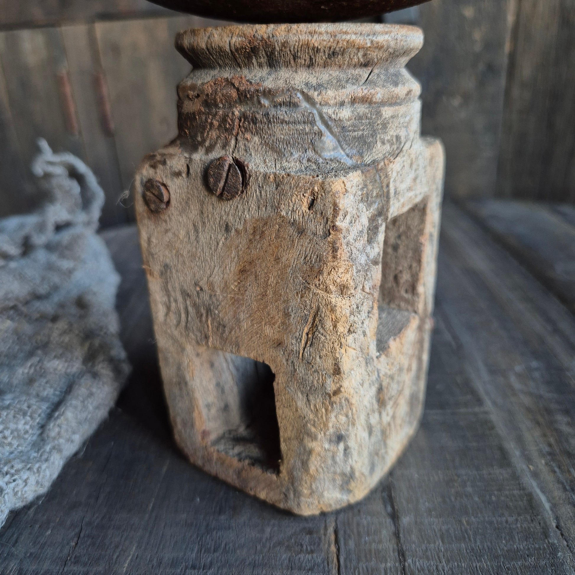 Een mooi oud houten kandelaar met unieke details. Past mooi binnen een stoer, sober en landelijk interieur!