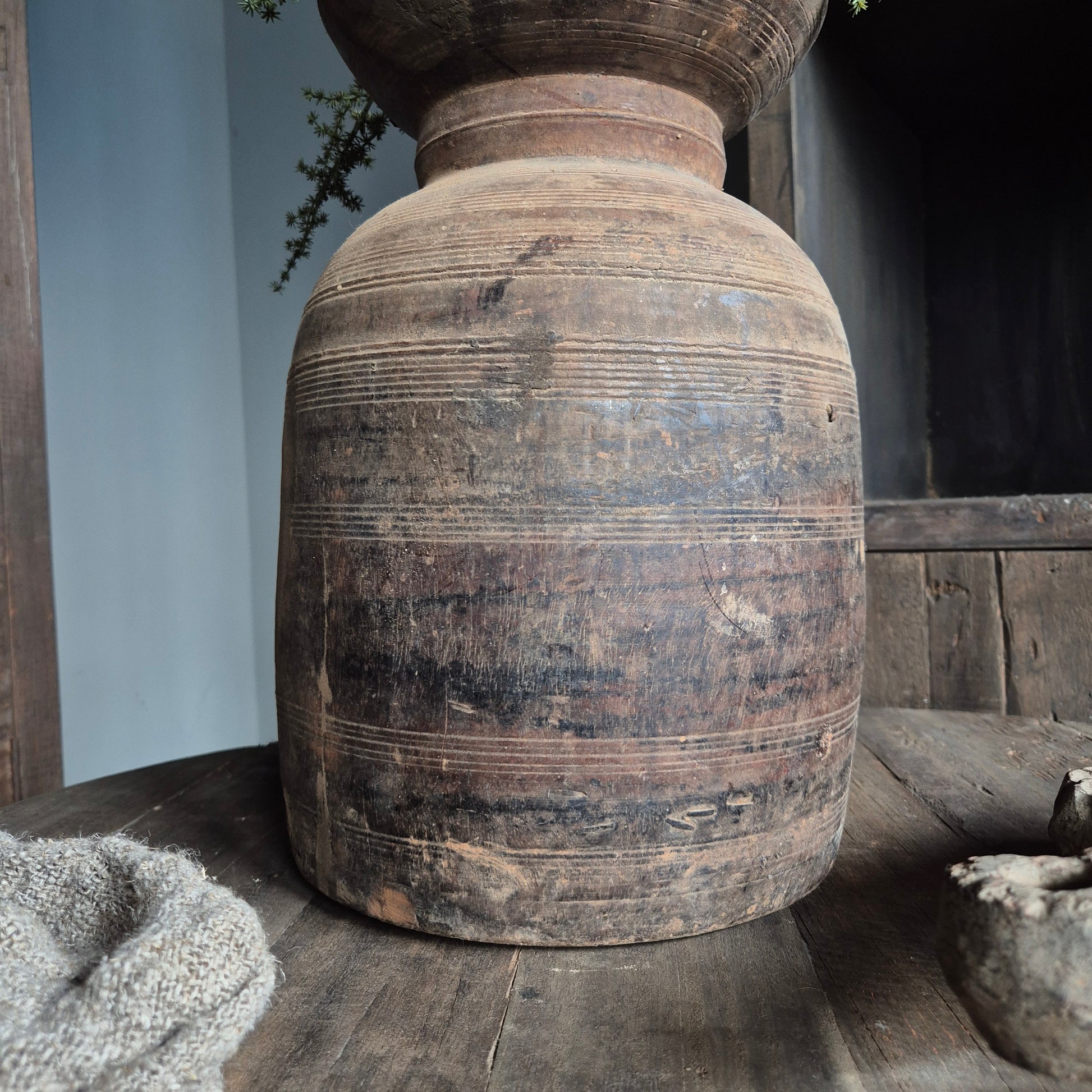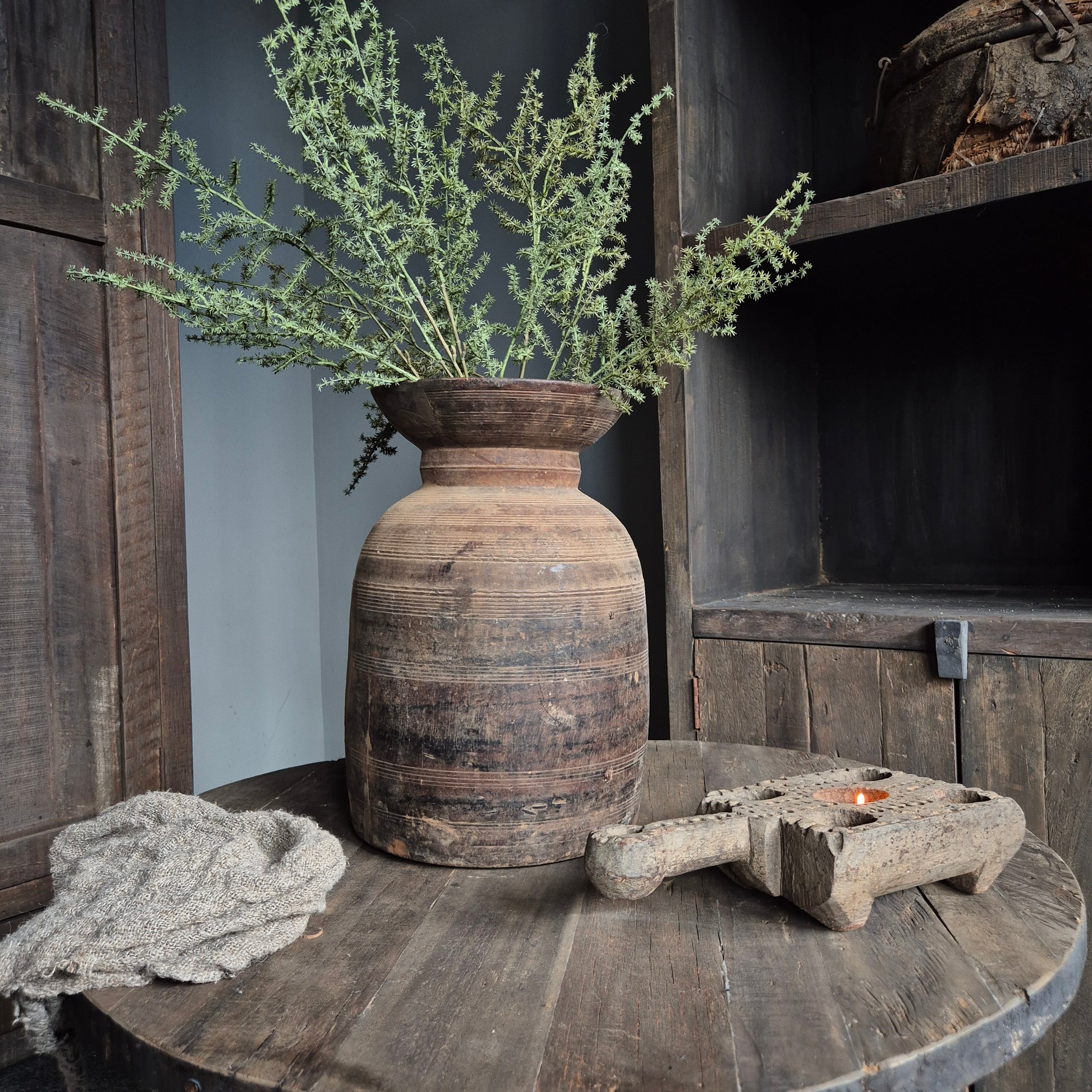 Een prachtig oud houten Nepalese kruik. Staat mooi binnen een stoer, sober en landelijk interieur!