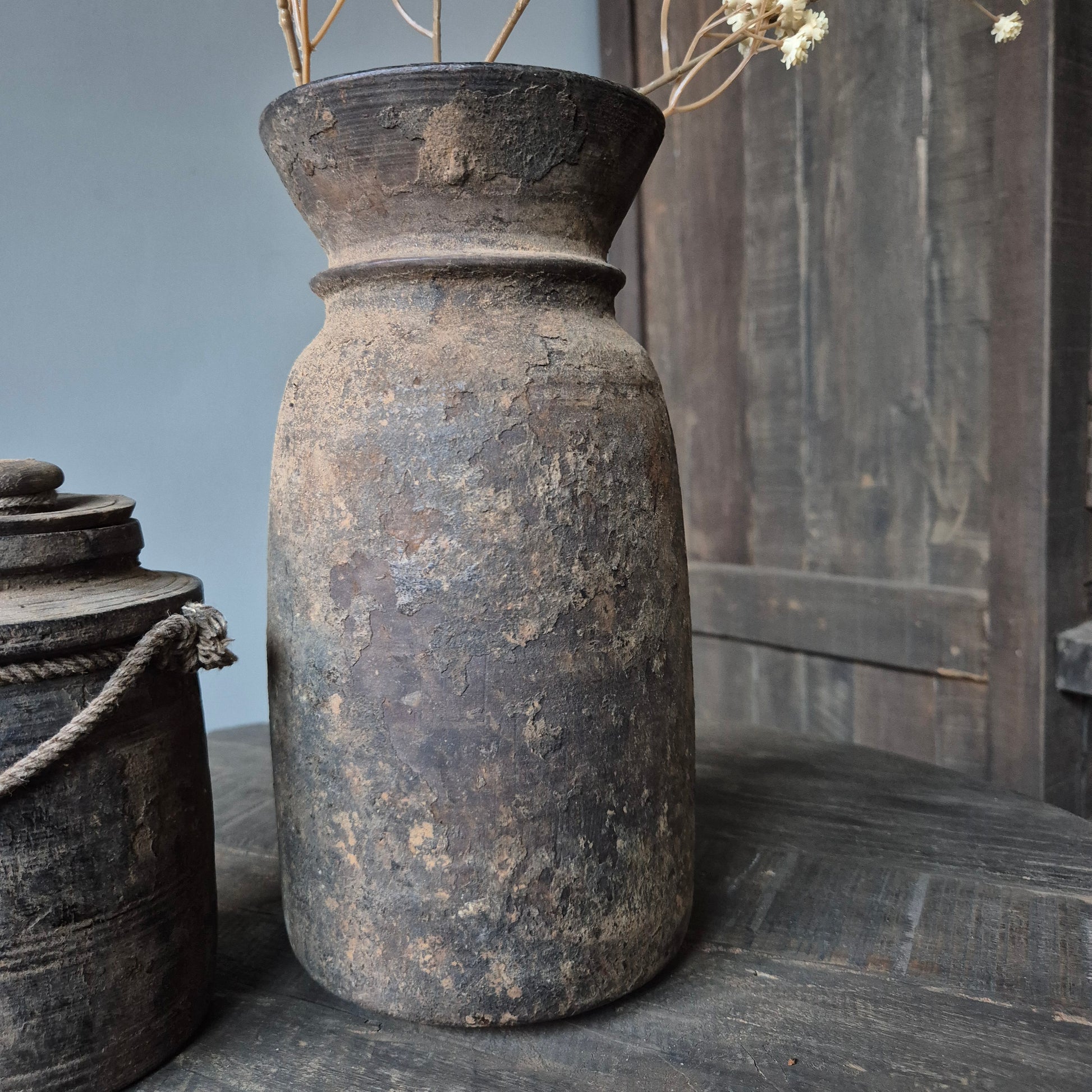 Een prachtig oud houten Nepalese kruik. Staat mooi binnen een stoer, sober en landelijk interieur!