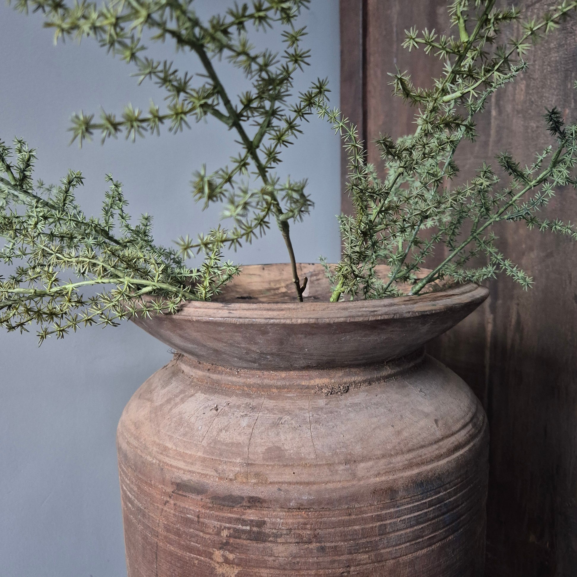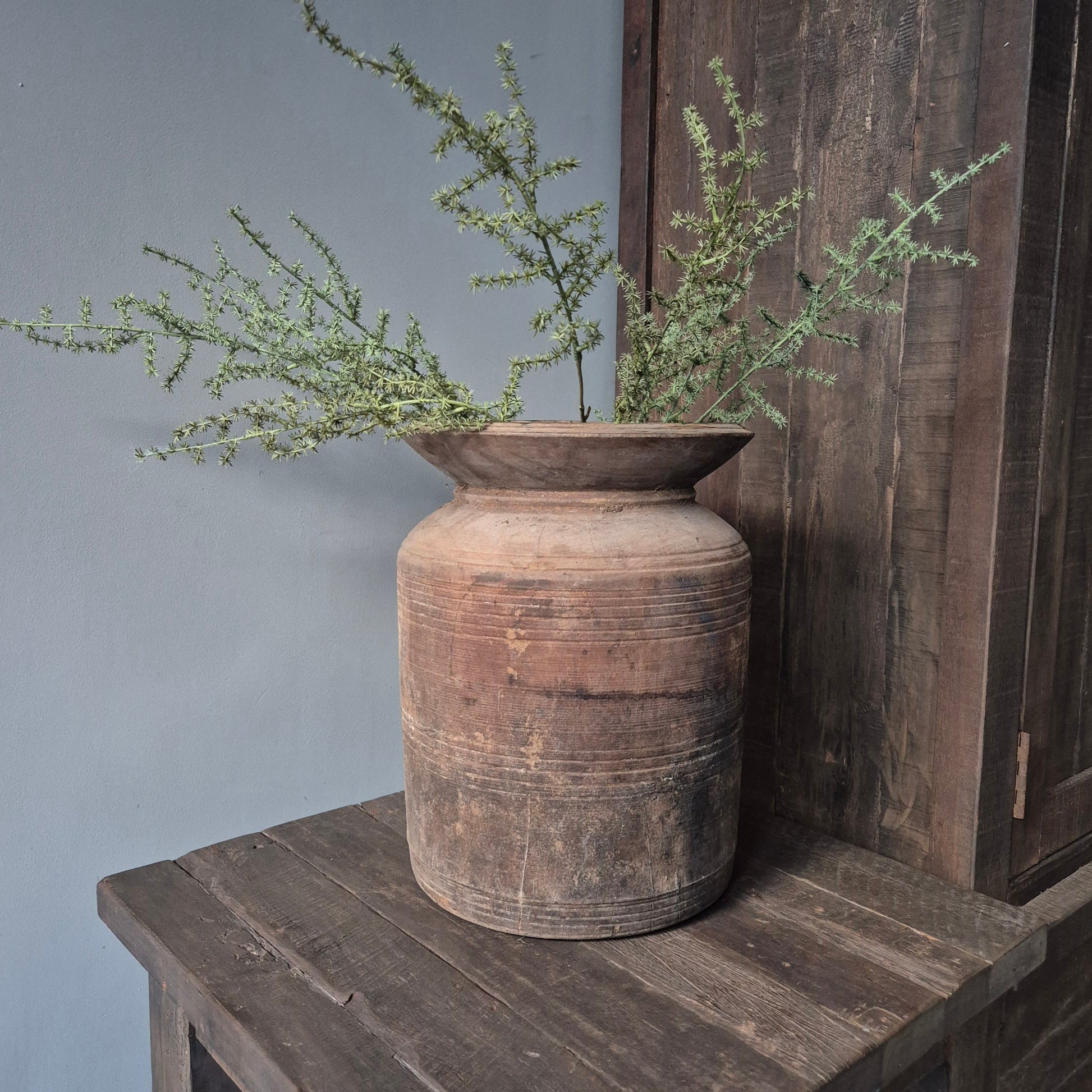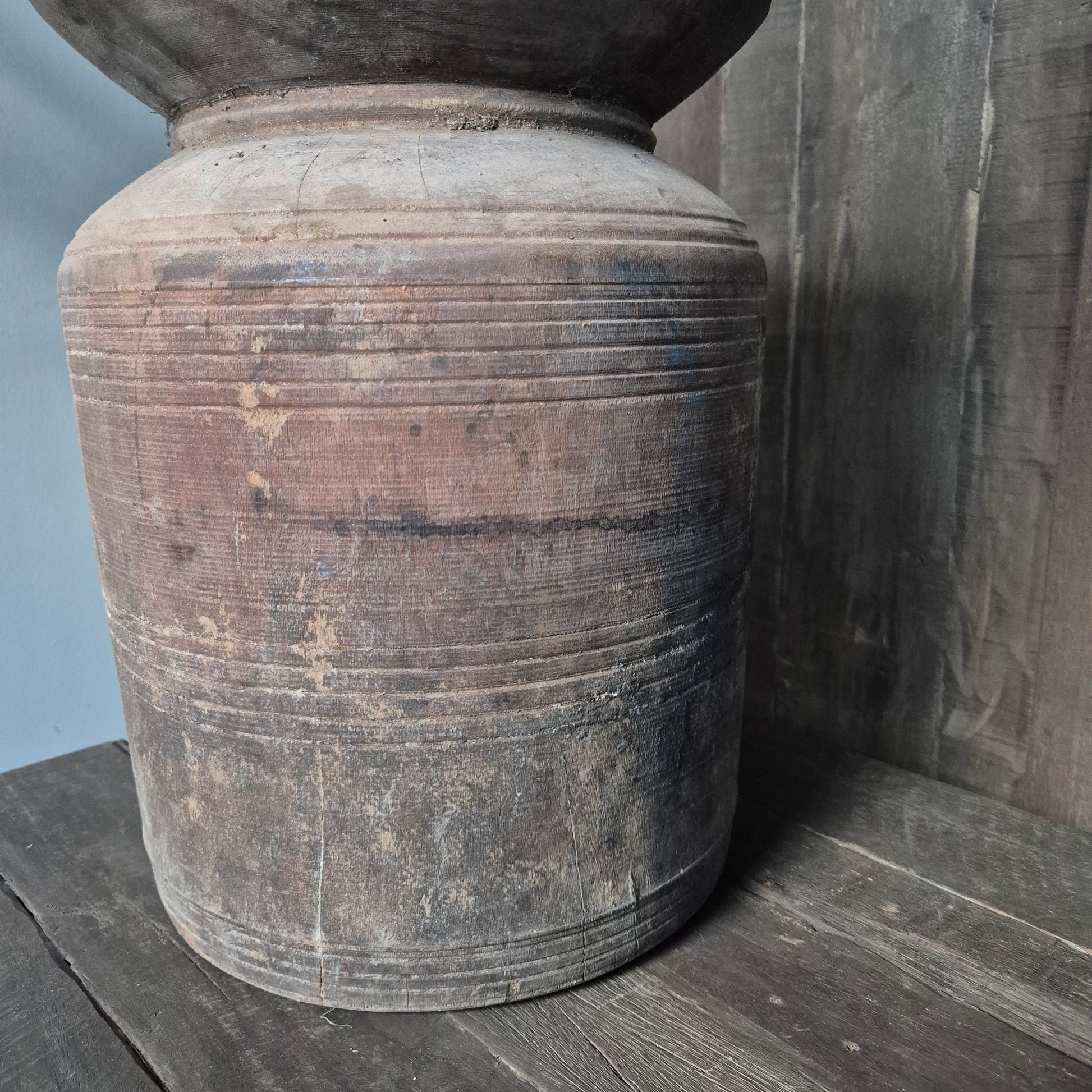 Een prachtig oud houten Nepalese kruik. Staat mooi binnen een stoer, sober en landelijk interieur!