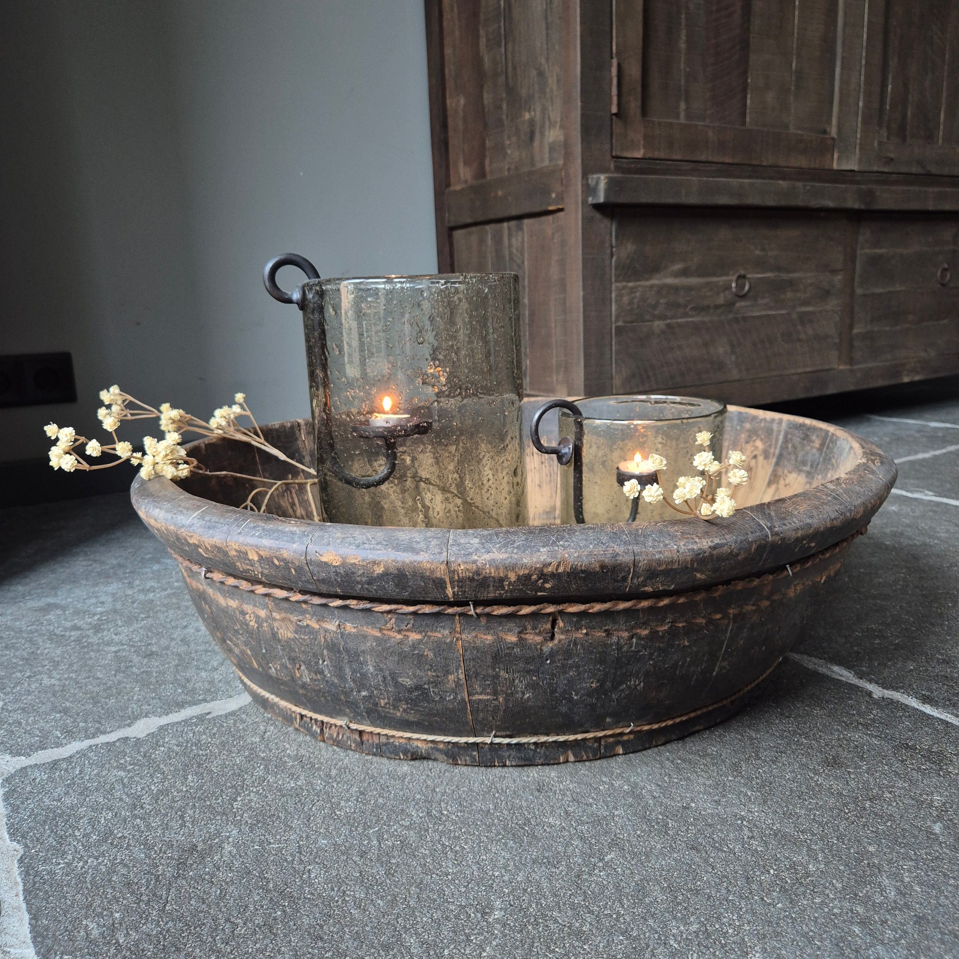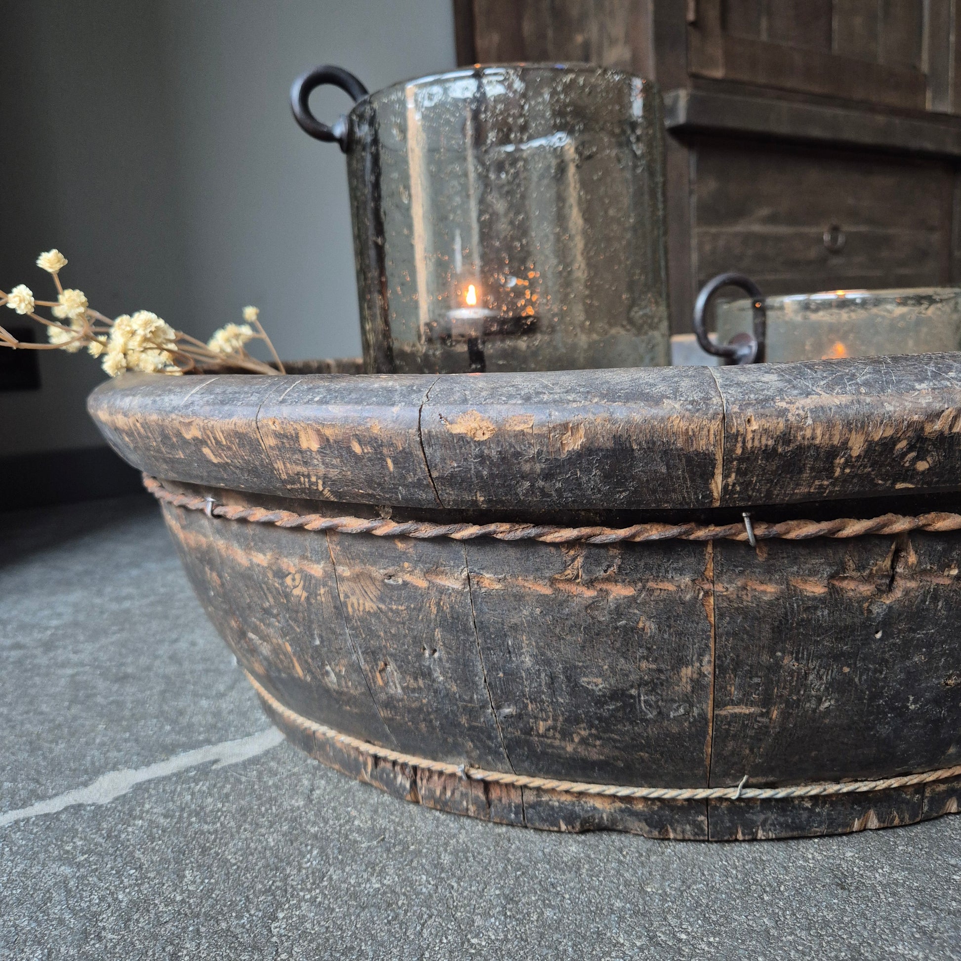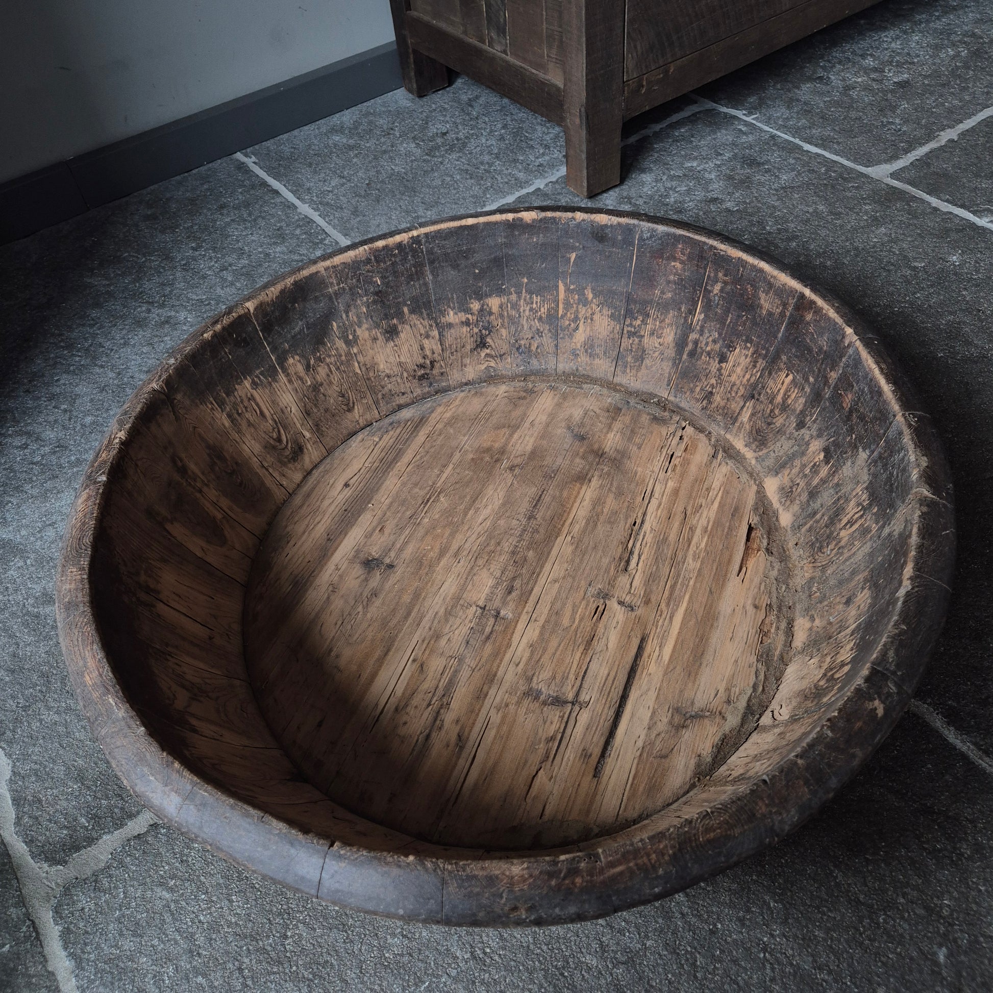 Deze oud houten olijfbak is 18cm hoog en heeft een diameter van 66cm.