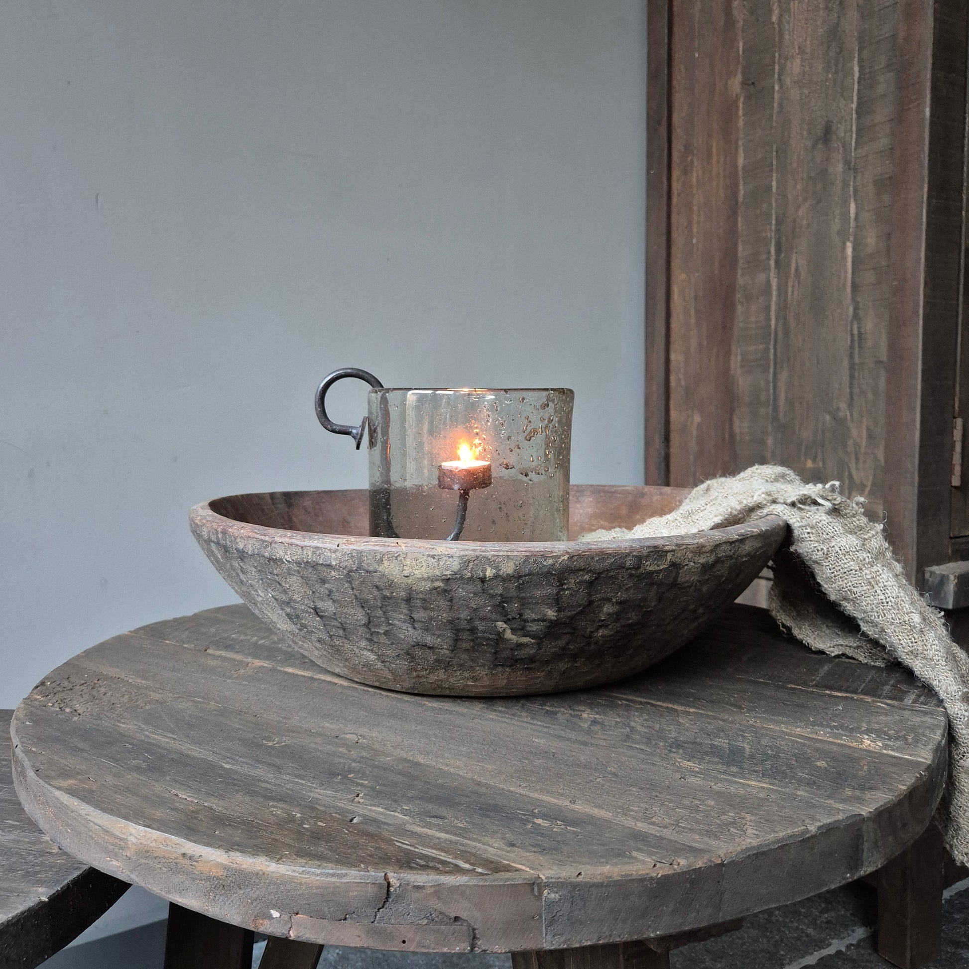 Een prachtig oud houten schaal. Deze schaal staat erg mooi op de eettafel met een krans of windlicht erin. Een pronkstuk binnen een stoer, sober en landelijk interieur.