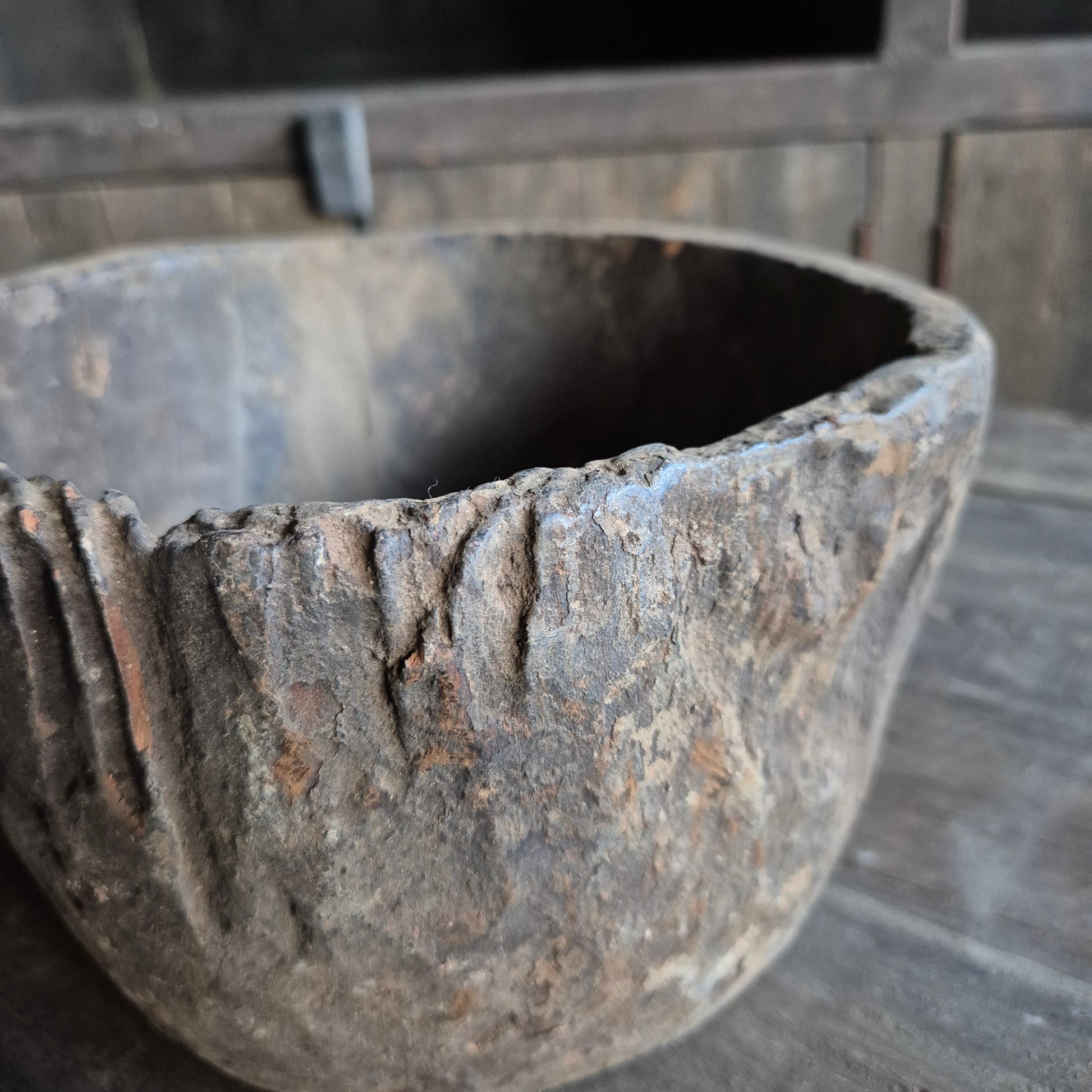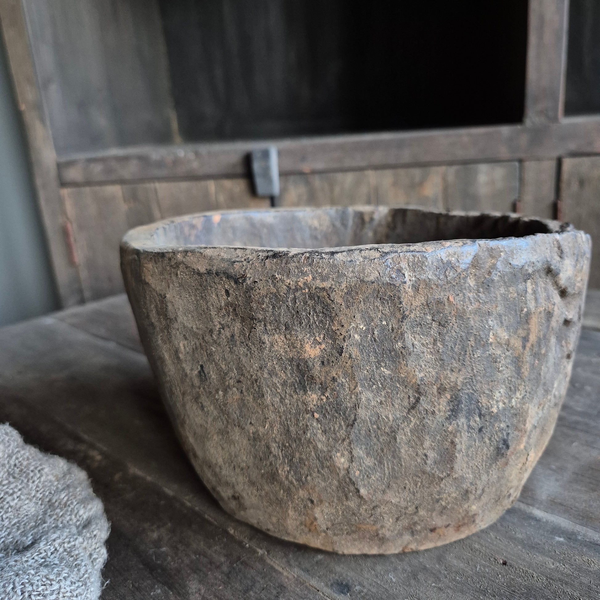 Een prachtig oud houten vijzel | schaal. Deze schaal staat erg mooi op de eettafel met een krans of windlicht erin. Een pronkstuk binnen een stoer, sober en landelijk interieur.