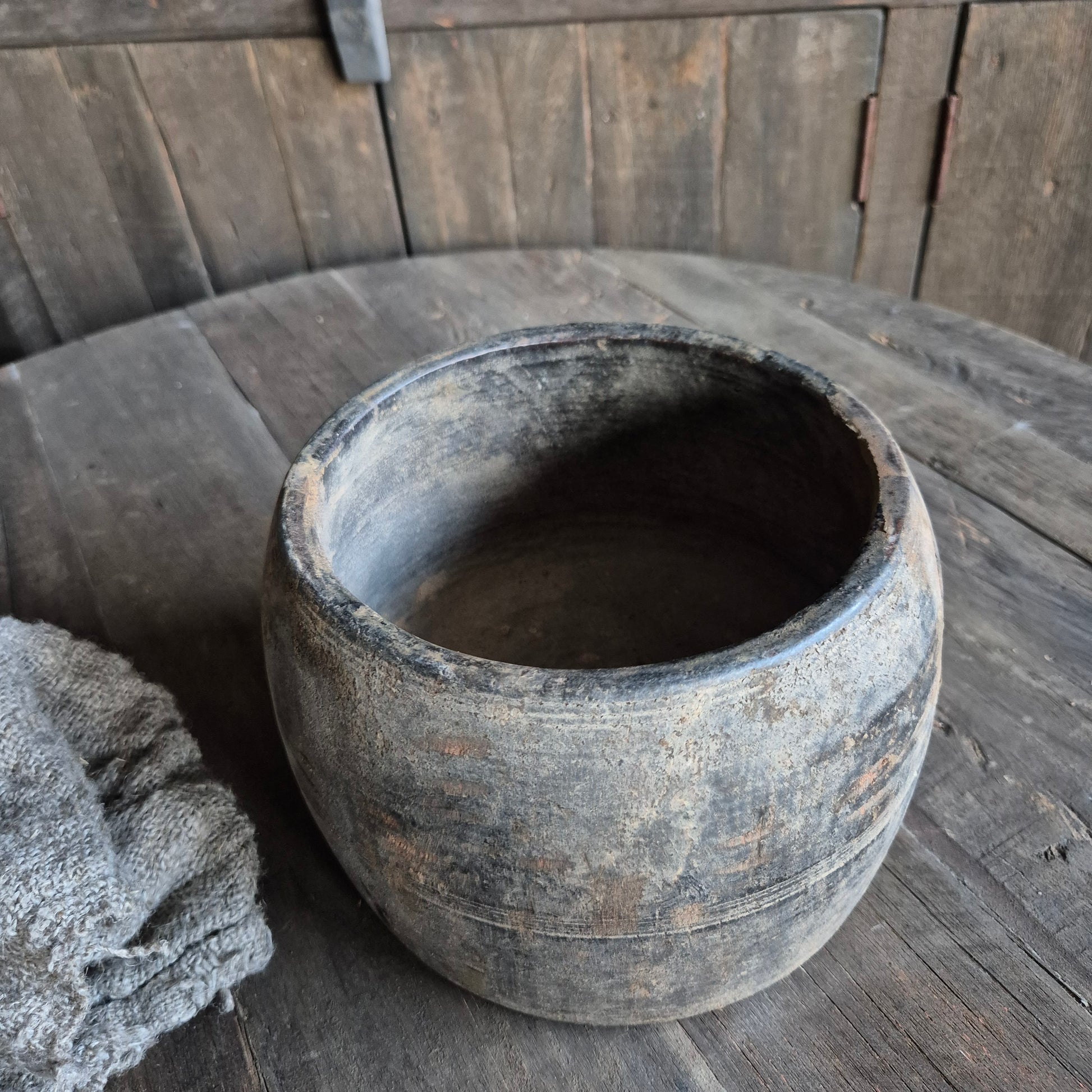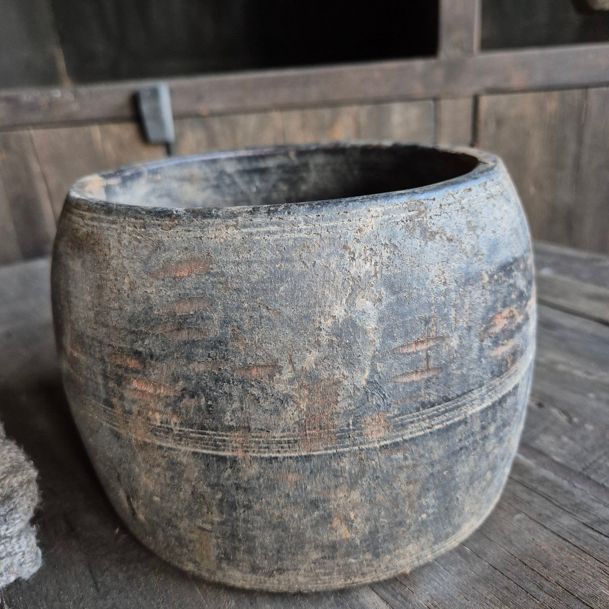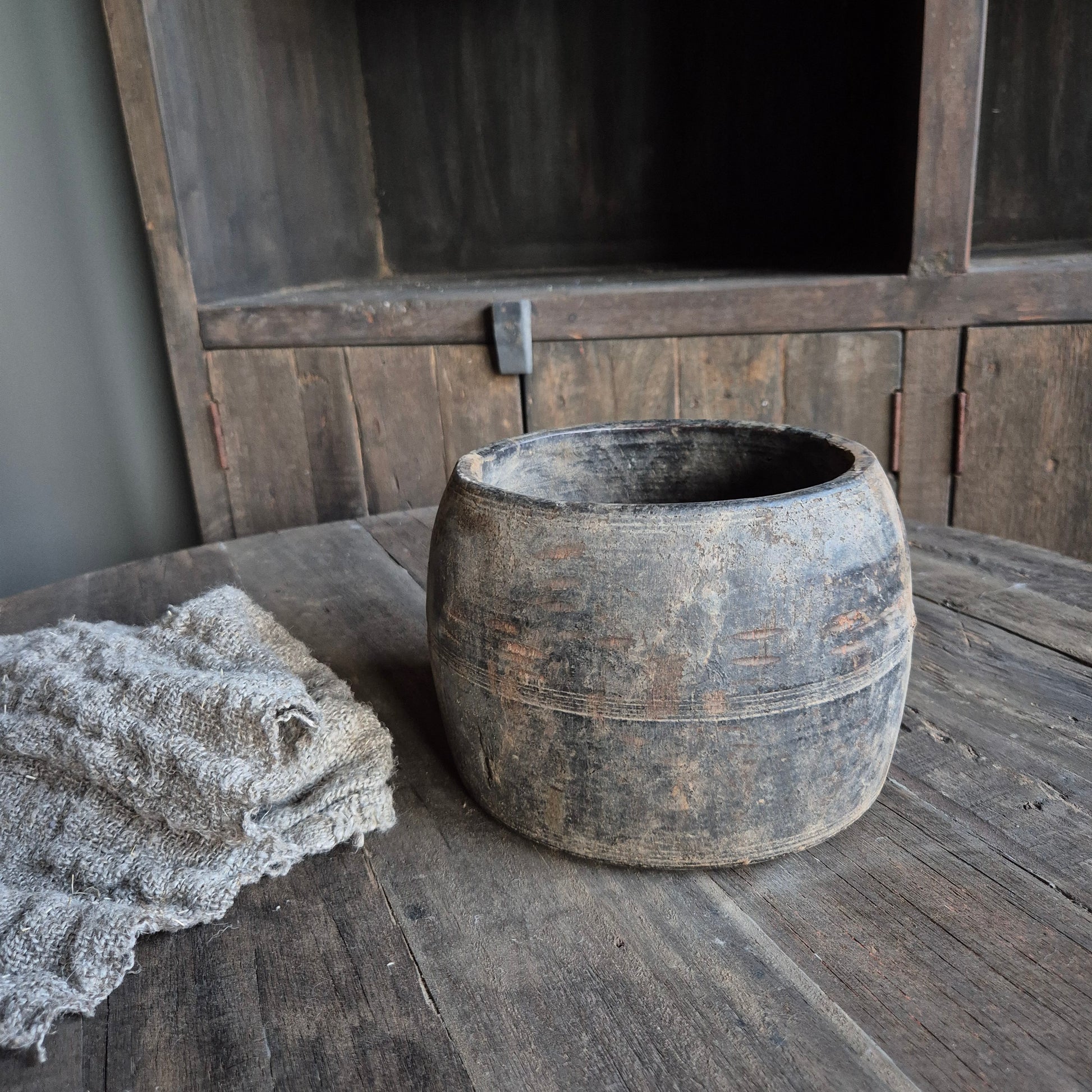 Een prachtig oud houten vijzel | schaal. Deze schaal staat erg mooi op de eettafel met een krans of windlicht erin. Een pronkstuk binnen een stoer, sober en landelijk interieur.