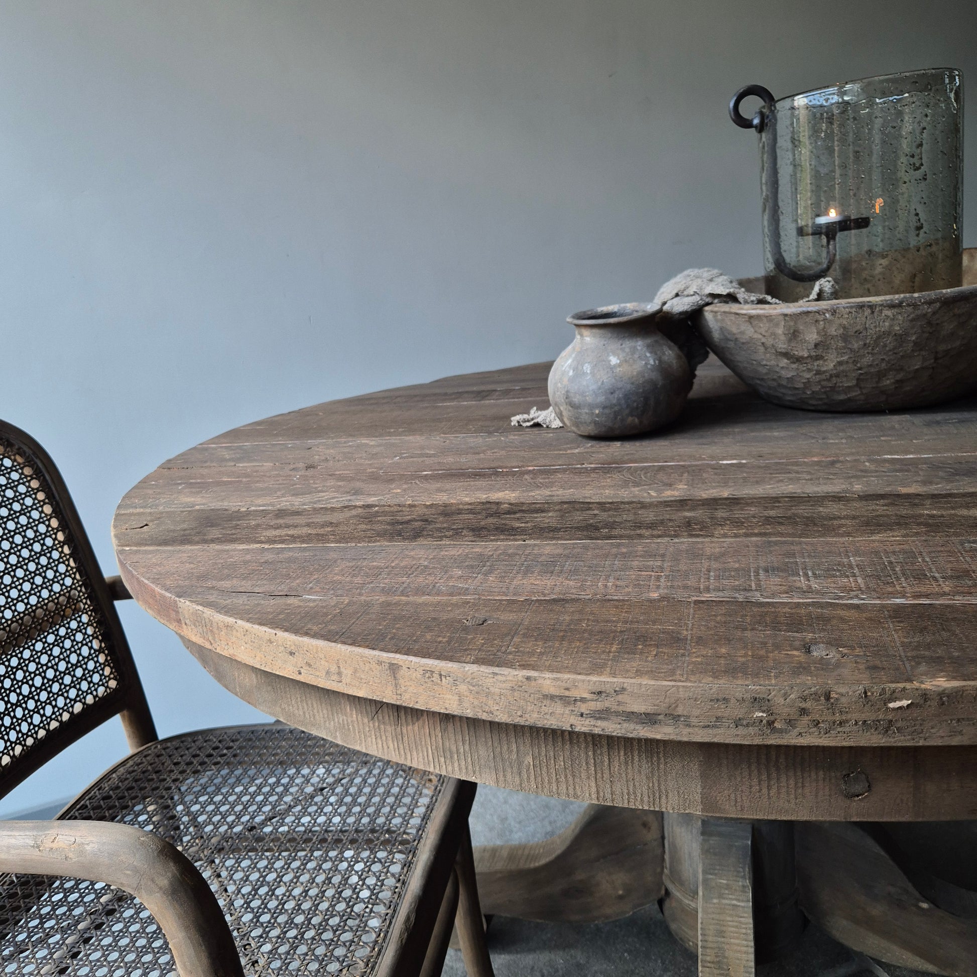 Een prachtige ronde klooster eettafel van oud hout driftwood. Een zwaar en stevig model met een blad van 4cm dik en dikke poten. In verschillende maten verkrijgbaar. Deze ronde eettafel mag niet ontbreken binnen een stoer, sober en landelijk interieur! De tafel is ca. 79cm hoog, de onderkant van het blad is ca. 70cm hoog.