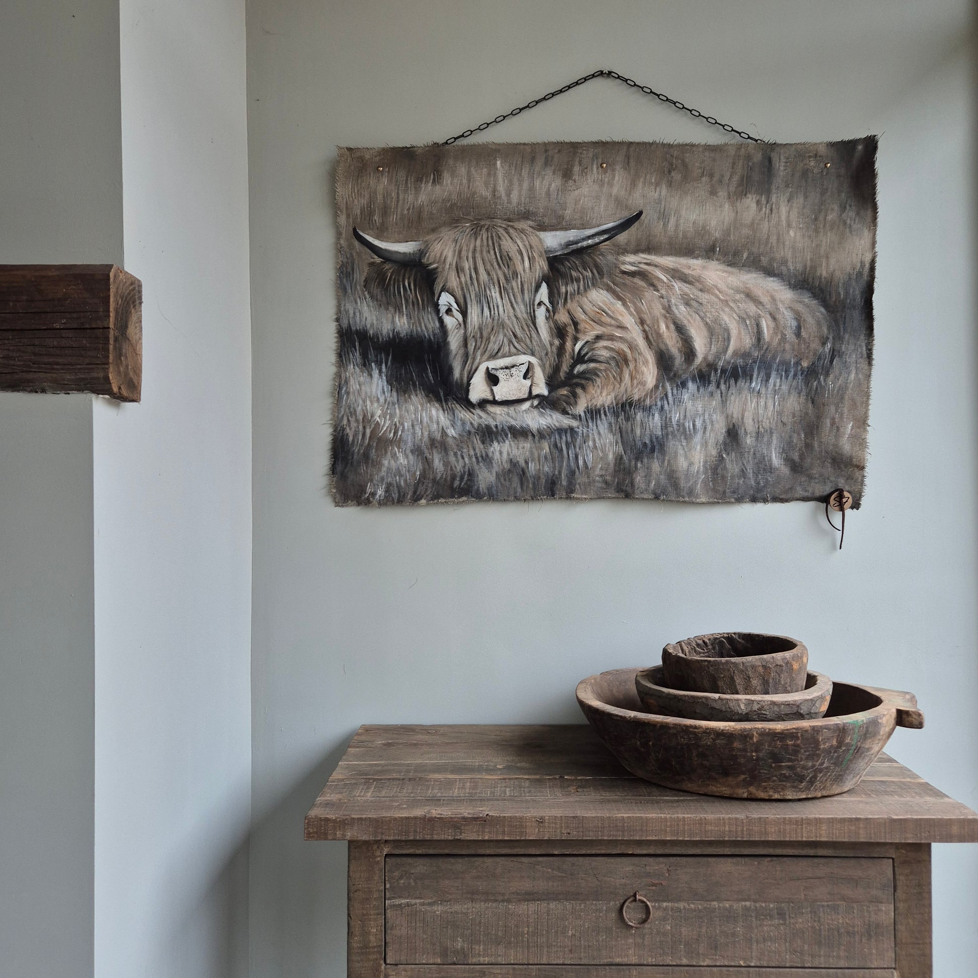 Een prachtig en uniek handgeschilderd wanddoek door San7. Een pronkstuk voor aan de muur binnen een stoer, sober en landelijk interieur!