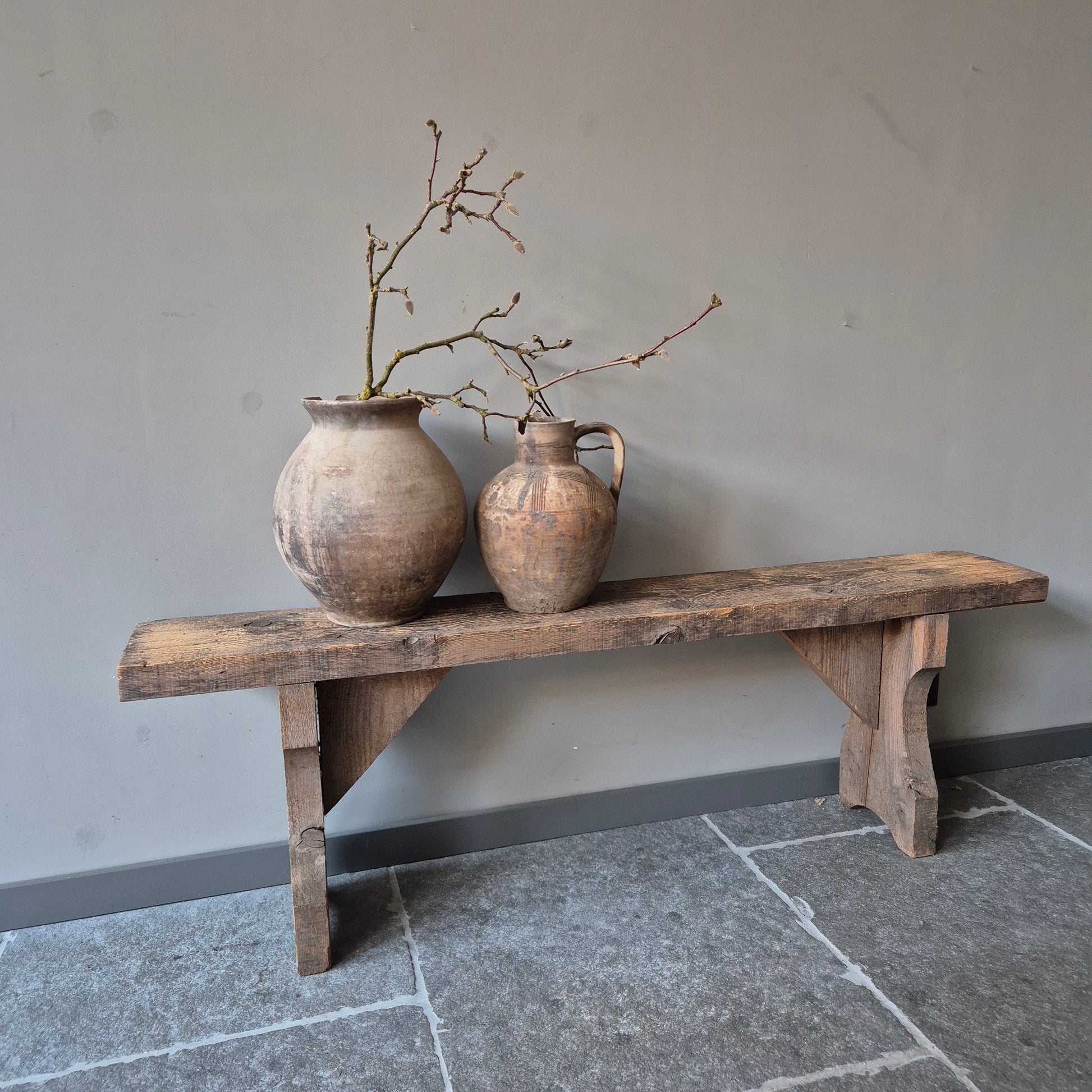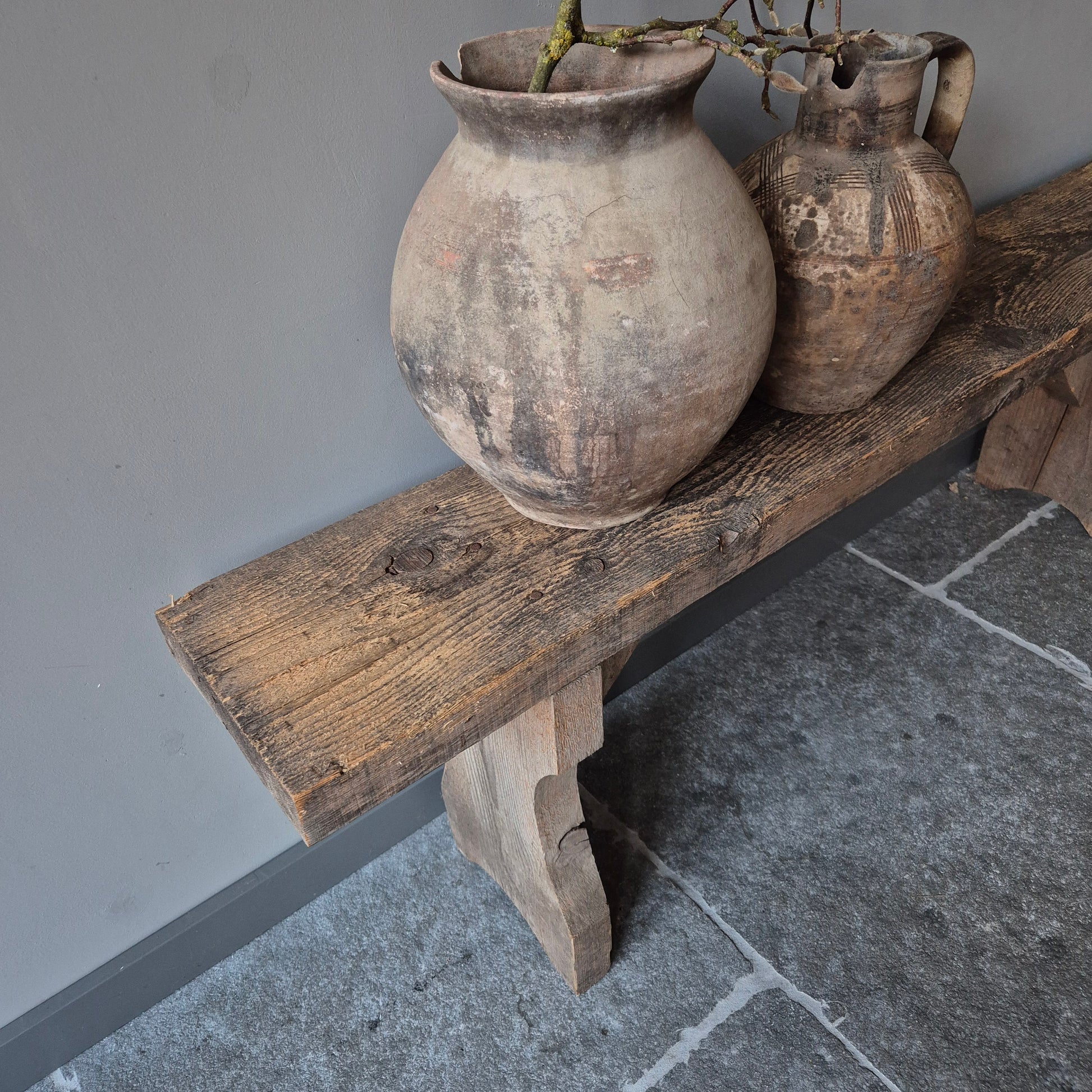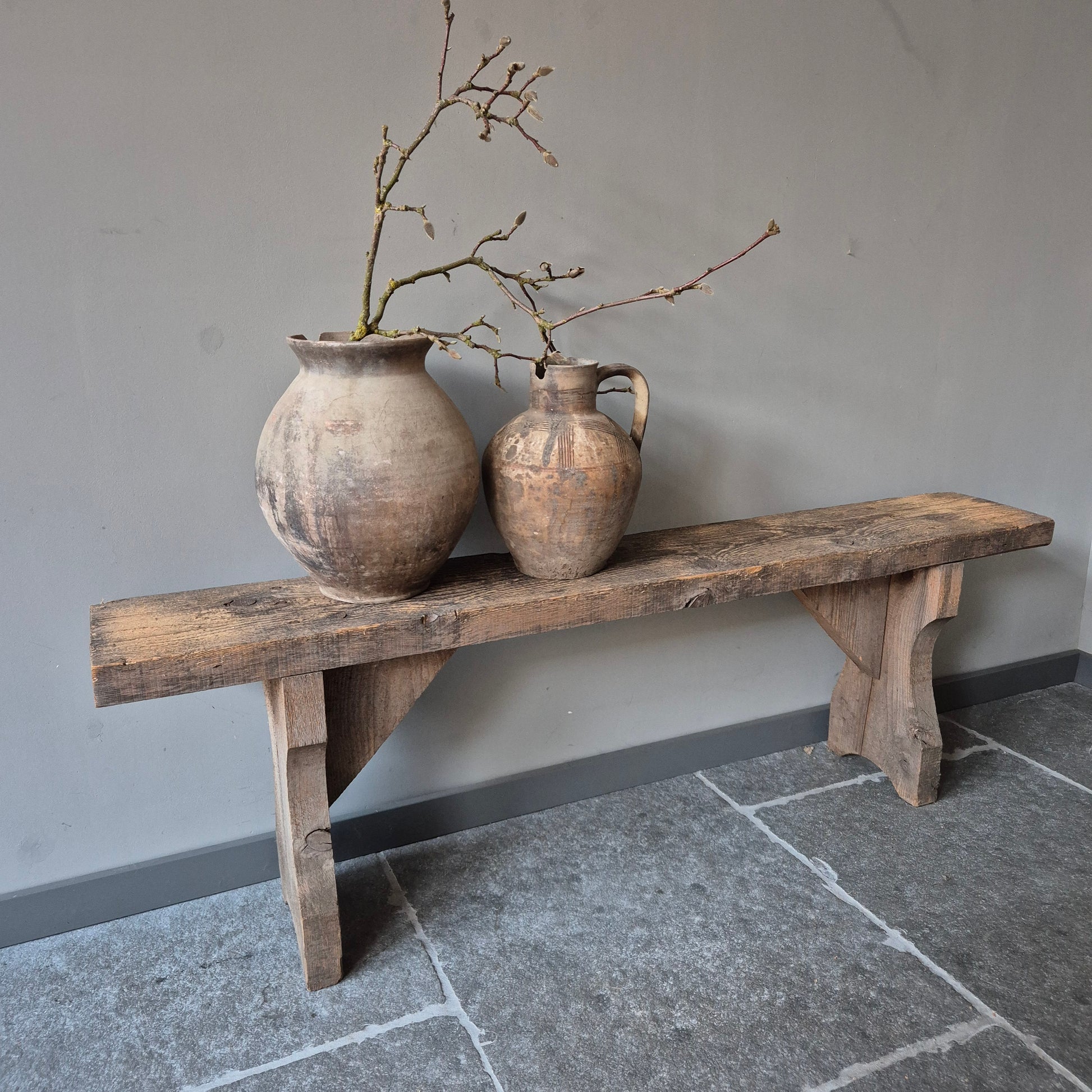 Een prachtig oud houten bankje. Een mooi en authentiek item binnen een stoer, sober en landelijk interieur!