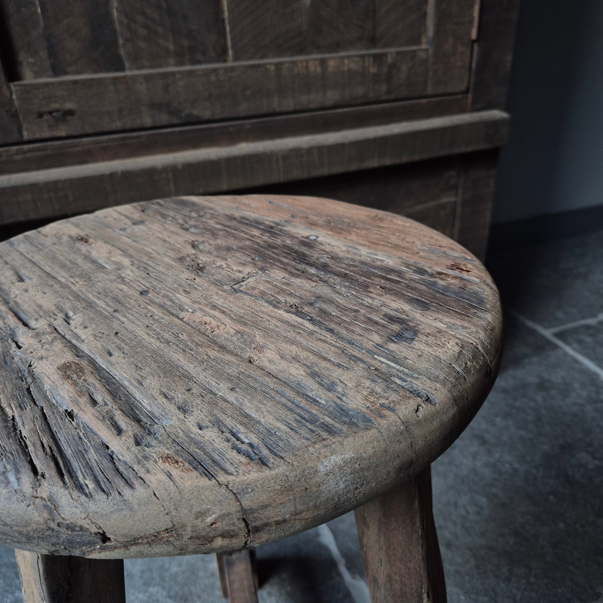 Een prachtig en uniek oud houten ronde kruk. Erg leuk om te gebruiken als bijzettafeltje binnen een stoer, sober en landelijk interieur!