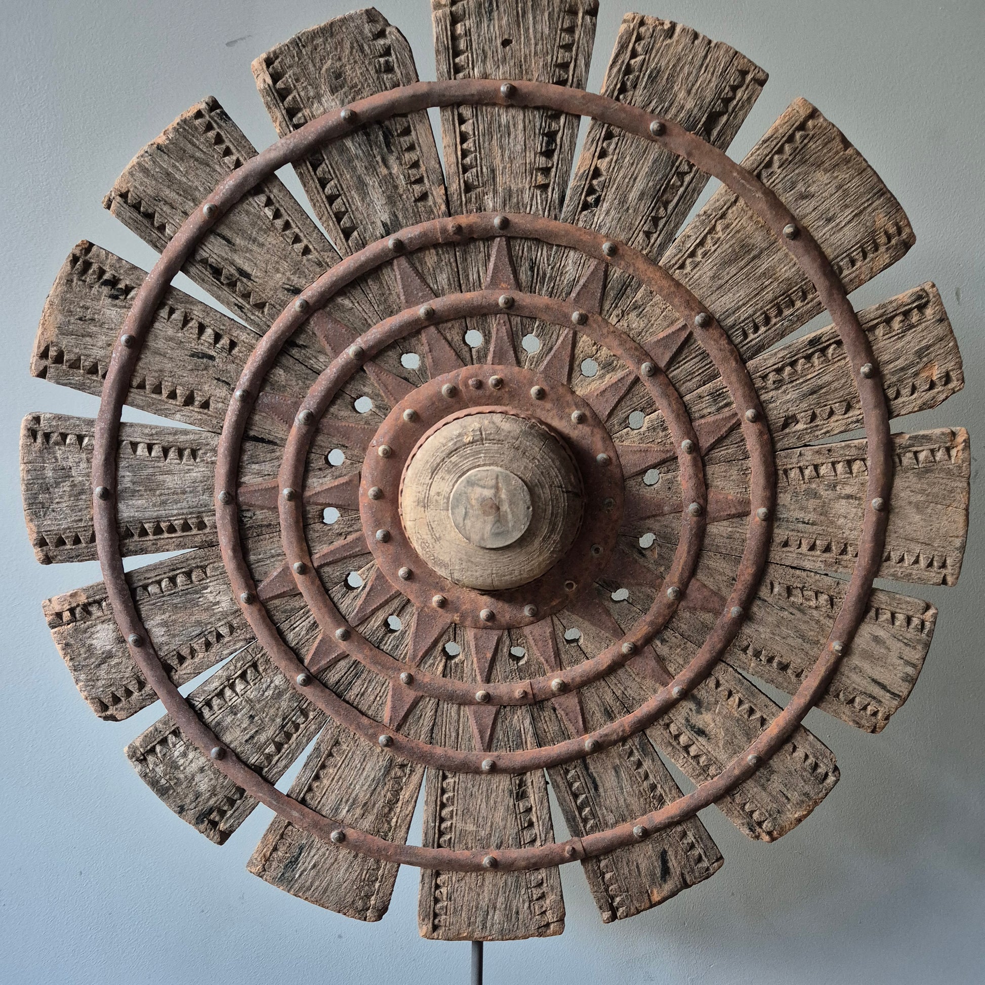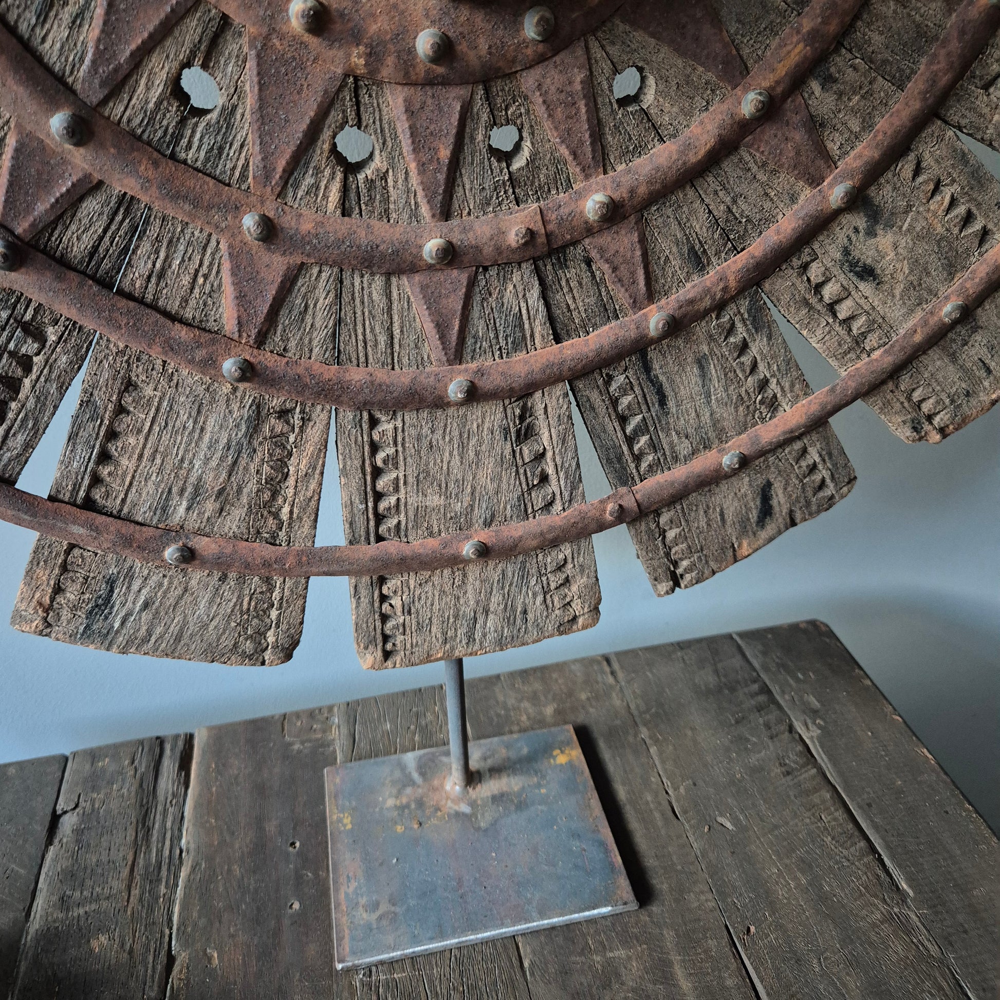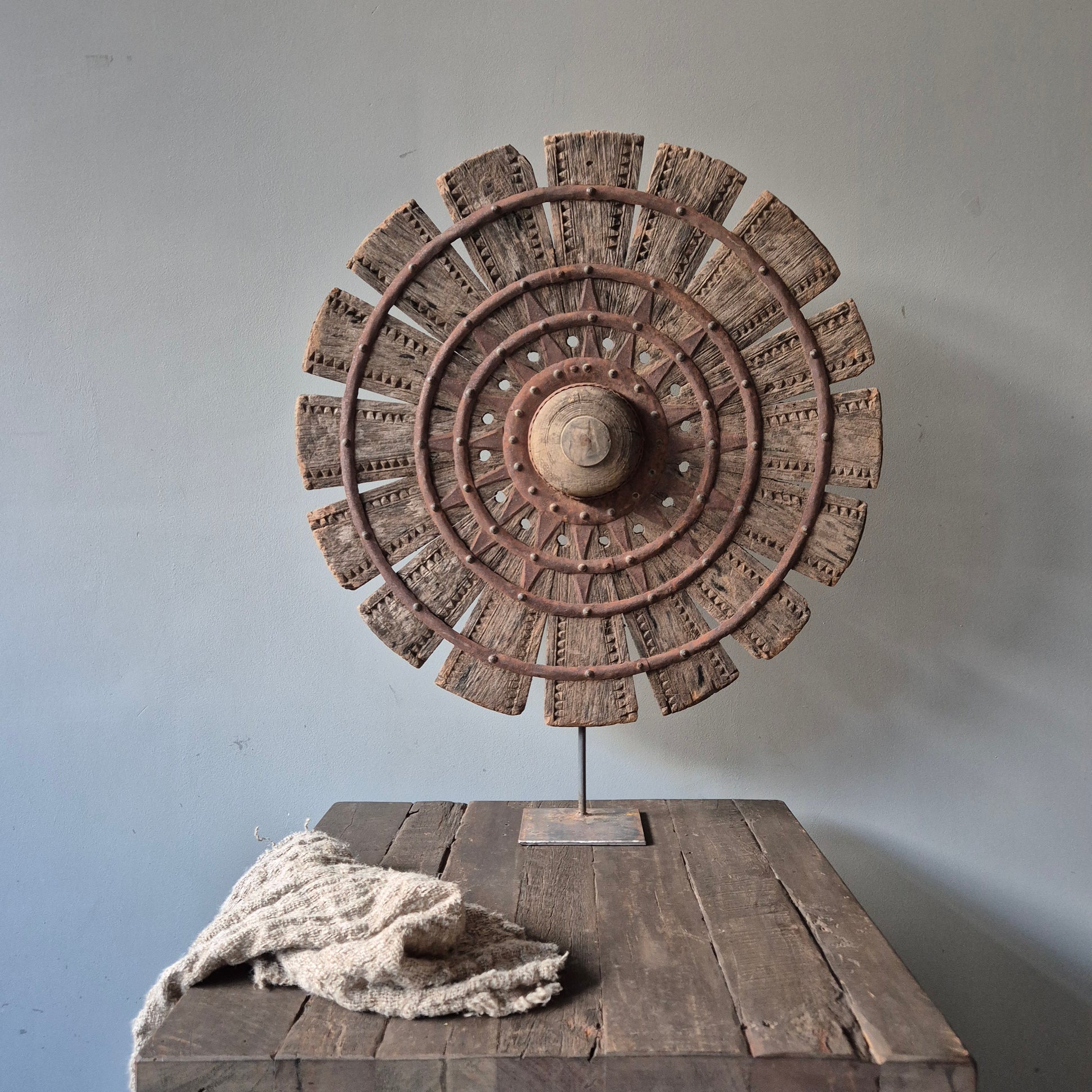 Een prachtig oude houten spinnewiel op ijzeren statief. Staat mooi op een vensterbank, op een dressoir in een stoer, sober en landelijk interieur.