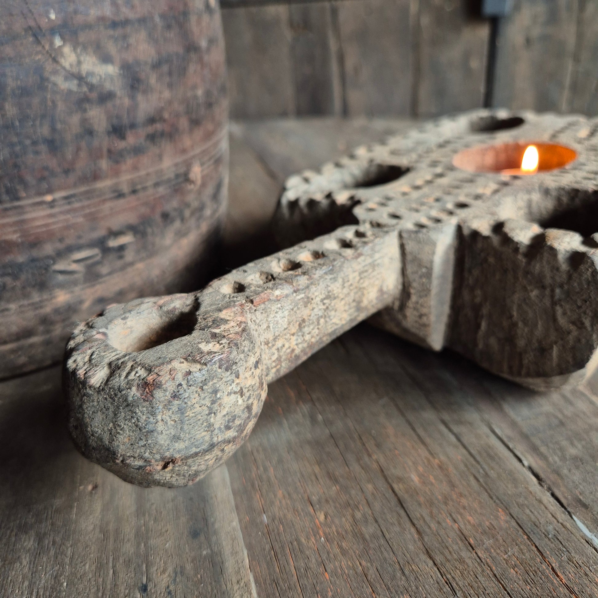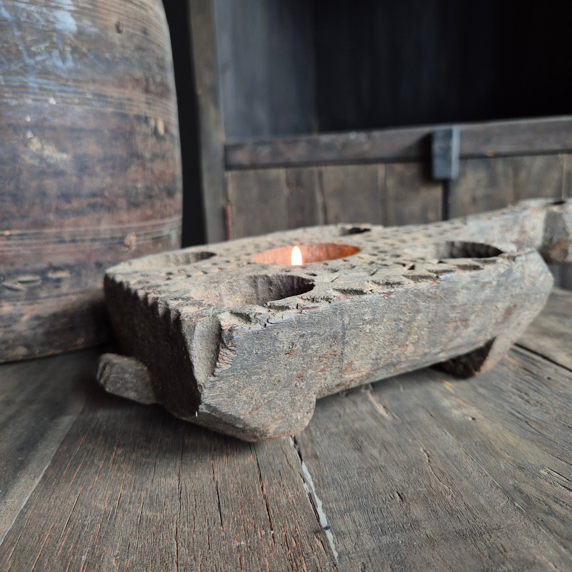 Uniek oud houten theelicht ornament
